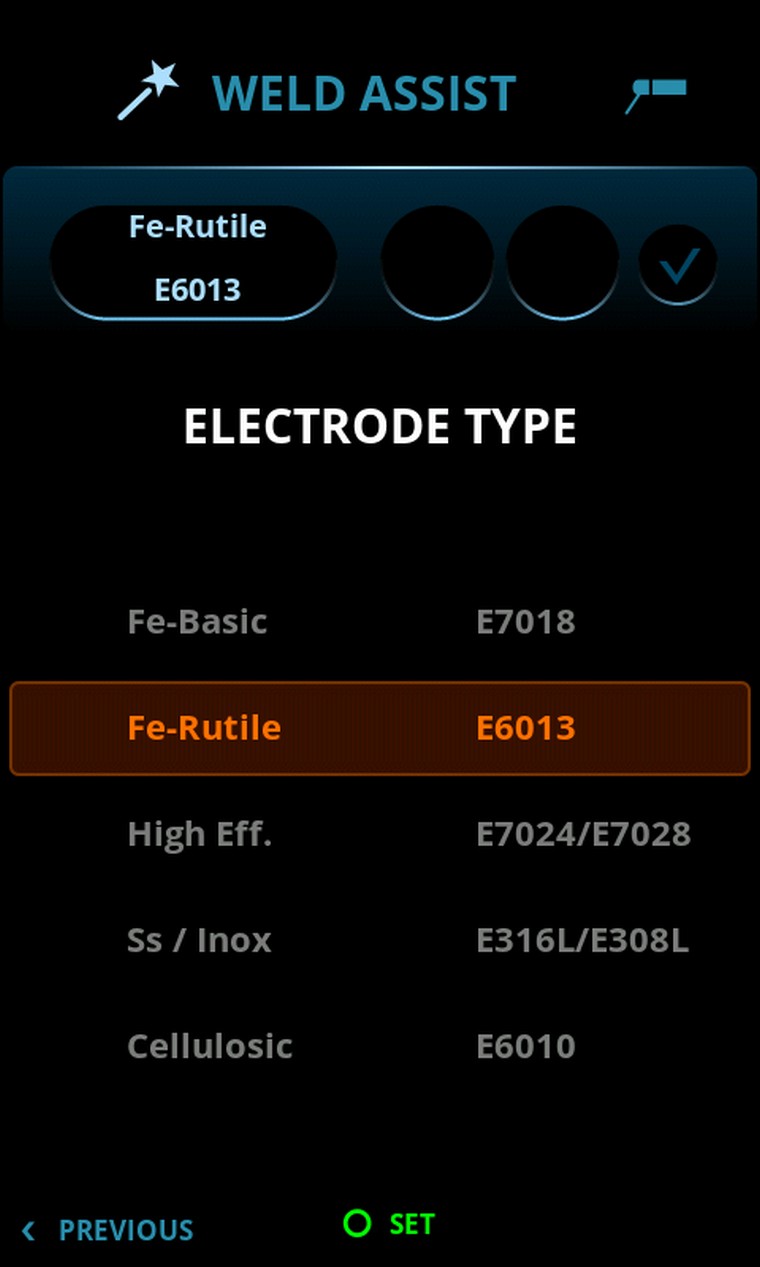Die Master 315 garantiert optimale Schweißleistung und eine schnelle Parametereinstellung, die durch das innovative Weld Assist Auswahltool unterstützt wird. Weld Assist gewährleistet, dass unabhängig von Ihrer Schweißerfahrung geeignete Parameter für jede Anwendung eingestellt werden. Wählen Sie Elektrodentyp, Elektrodengröße und Fugenart aus, und Weld Assist nimmt die perfekte Einstellung für Sie vor.